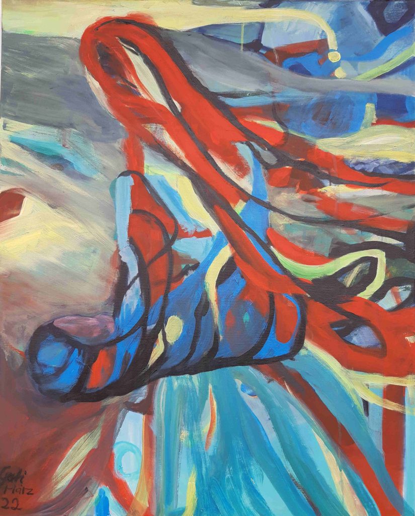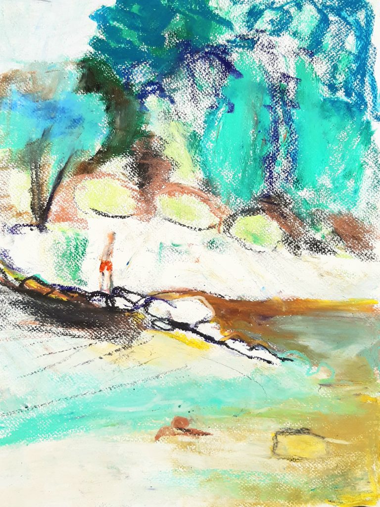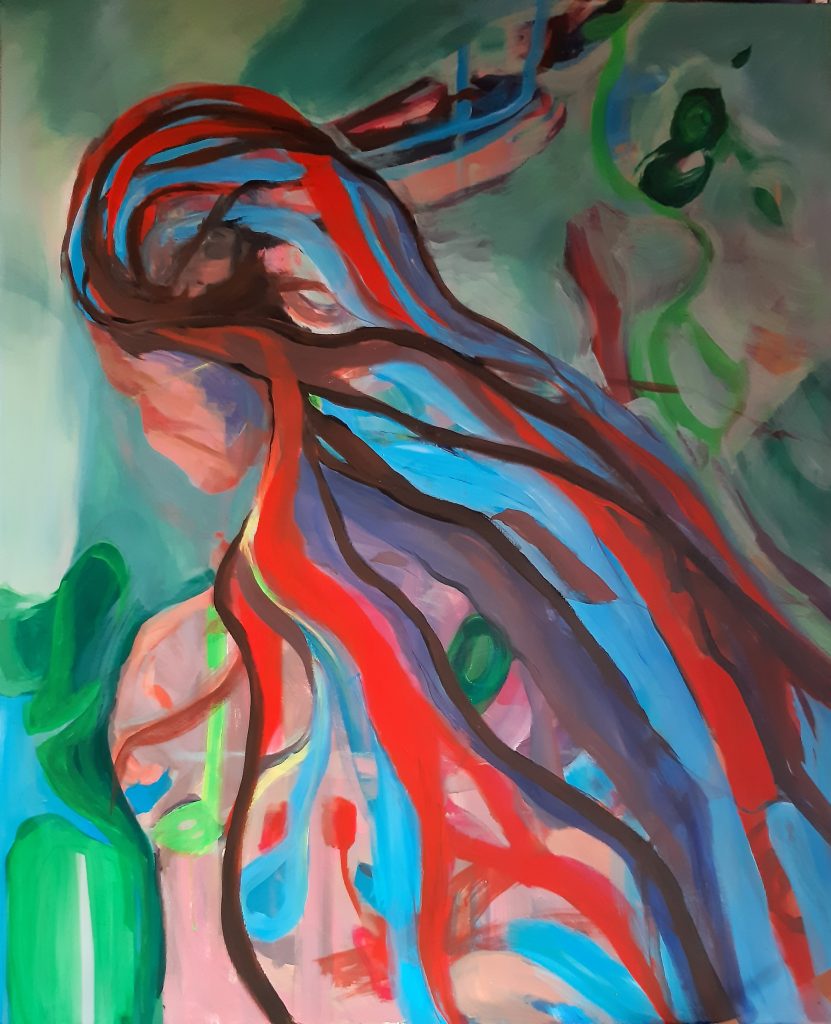 Gedanken Acryl auf Leinwand Höhe 110 cm, Breite 90 cm, Tiefe 2 cm, Juni/Juli 2022Badende an der Mangfall