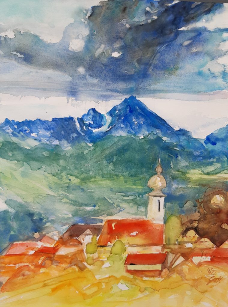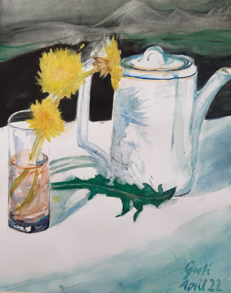 Erbstück und Löwenzahn, Aquarell auf Papier, Fabriano Artistico 300 g/m2, April 2022Löwenzahn und kriechender Günzel zur Kaffeestunde, Aquarell auf Papier, Old Holland, 39×47 cm, April 2022Lichtstimmung Hafen, Aquarell auf Papier, Arches 56×76 cm, Februar 2022Auf dem Weg, Acryl auf Leinwand, 80 x 100 cm, März 2022XAVERS GEBURTSTAG , Aquarell auf Papier, Old Holland 300 g/m2, 55 x 75 cm, April. 2022Vachendorf im Farbenkreis, Aquarell auf Papier, Hahnemühle Echt Bütten Aquarell 300 g/m2, 42x56xcm, April 2022