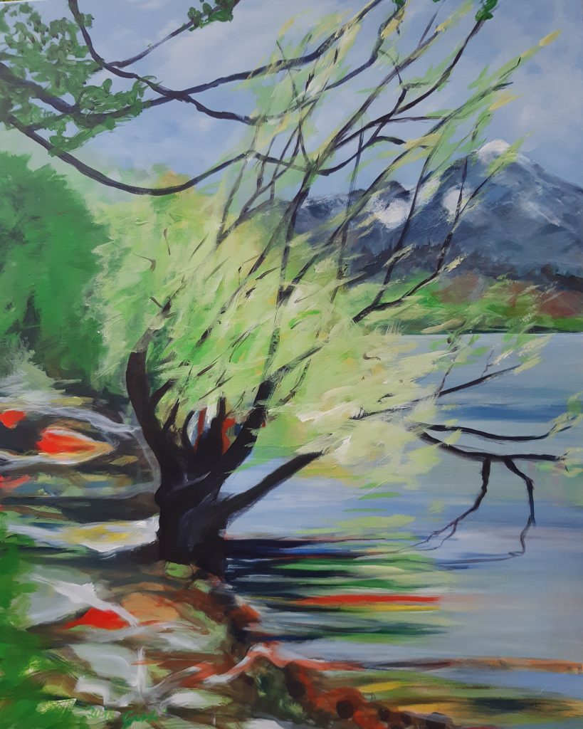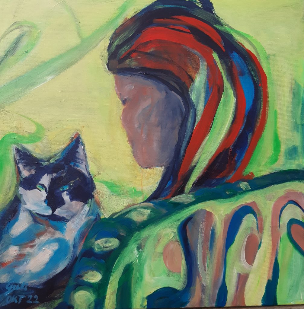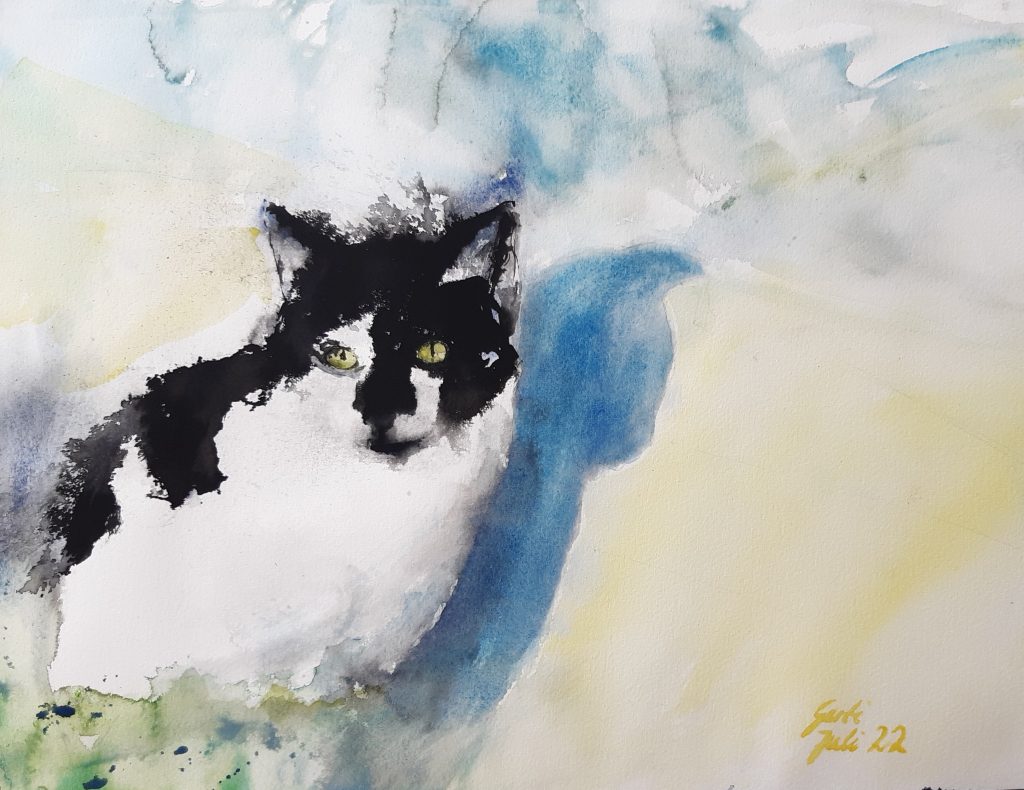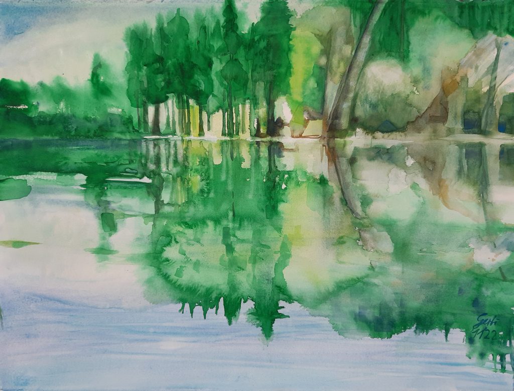 Katze Romeo im Blick, Acryl, 80x80x2 cm, Oktober 2022Tüttensee, Spiegelung grün, 58 x76 cm, Aquarell 640 g/m2, November 2022Mangfall