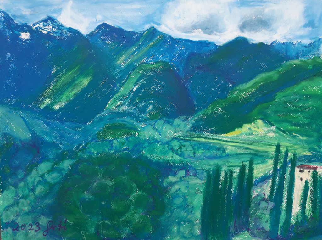 Wildfrauen, Acryl auf Leinwand, Breite: 80 cm, Höhe: 100 cm, 2024Drei Sennerinnen, Acryl auf Leinwand, 2024, Breite: 80 cm, Höhe: 100 cmVerwittert und Versteinert, Acryl auf Leinwand, 2024, Breite.110 cm, Höhe: 90Arco Hinterland, Pastell, Caran´dache auf Papier, 2023,40 cm x 30cm Avocados mit Messer, 1/ 2024, 50 cm x 50 cm, Hahnemühle Cornwall 450 g/m2Avocados im Glas, 50 cm x 50 cm, 12/ 2023, Aquarell auf Hahnemühle Cornwall 450 g/m2Zwetschgen im Glas 11/ 2023, 50 cm x 50 cm, Aquarell auf Papier Hahnemühle Cornwall, 450 g/ m2