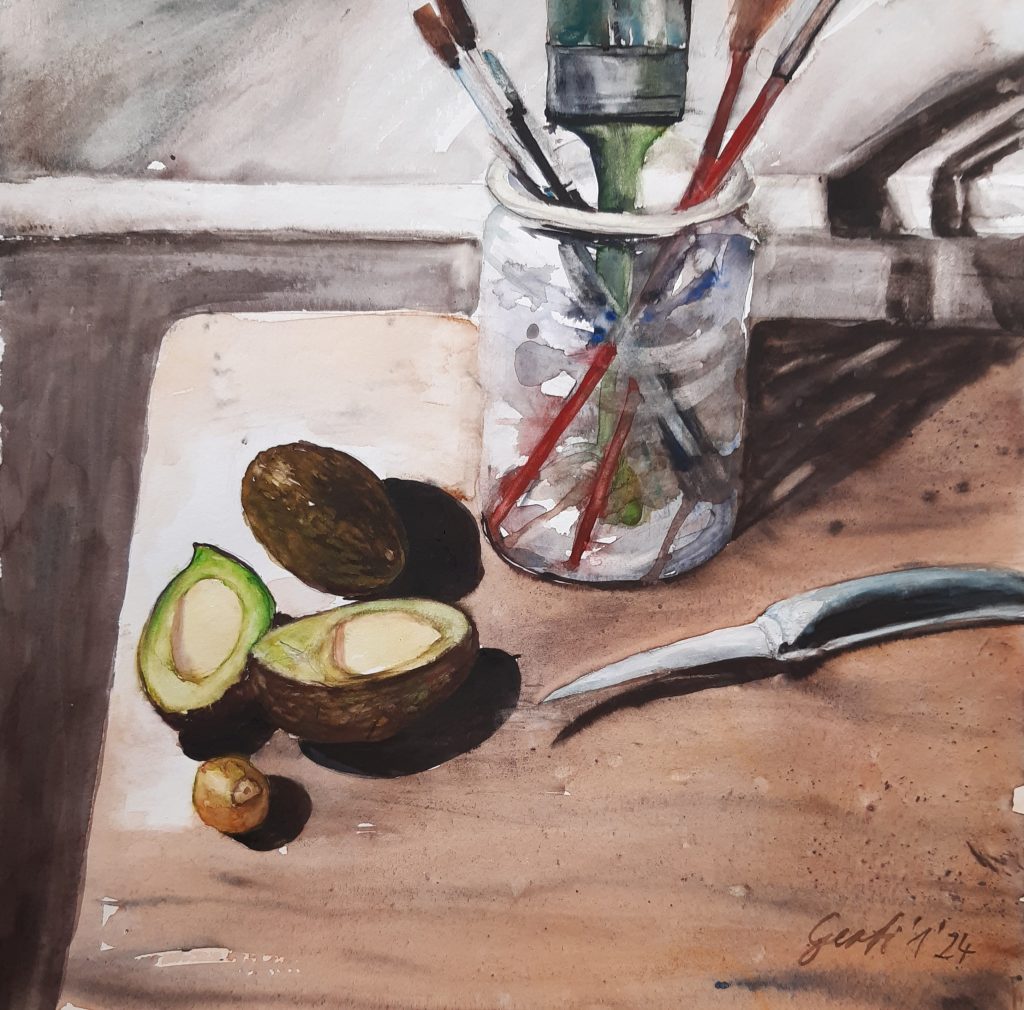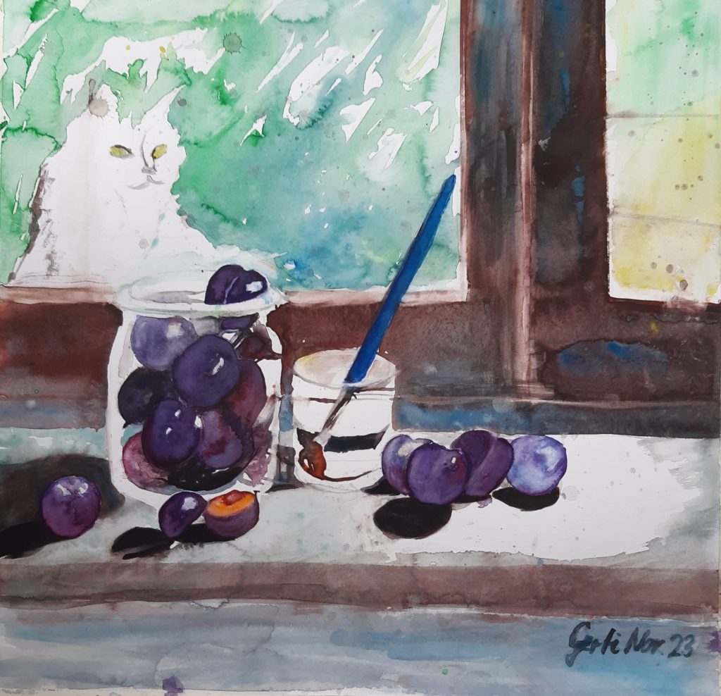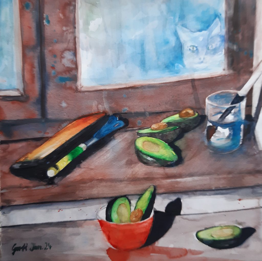 Zwetschgen im Glas und Katzenblick, 11/2023, Aquarell auf Papier, Hahnemühle Cornwall, 450 g/m2Avocados und Katzenblick, 50 cm x 50 cm, 1/2024, Aquarell auf Papier Hahnemühle Cornwall 450 g/m2