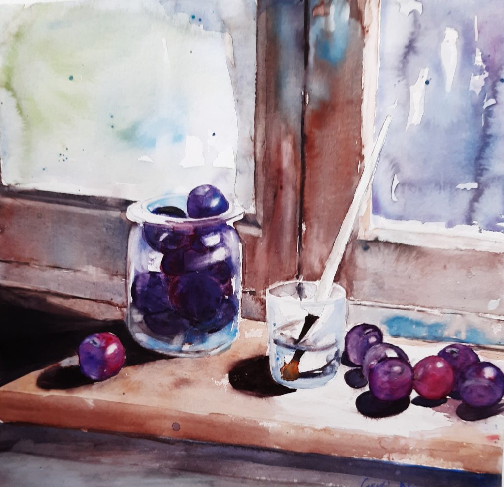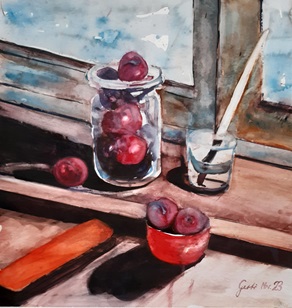 Zwetschgen im Glas rot, 50 cm x 50 cm, Aquarell auf Papier, Hahnemühle Cornwall 450 g/m2, November 2023
