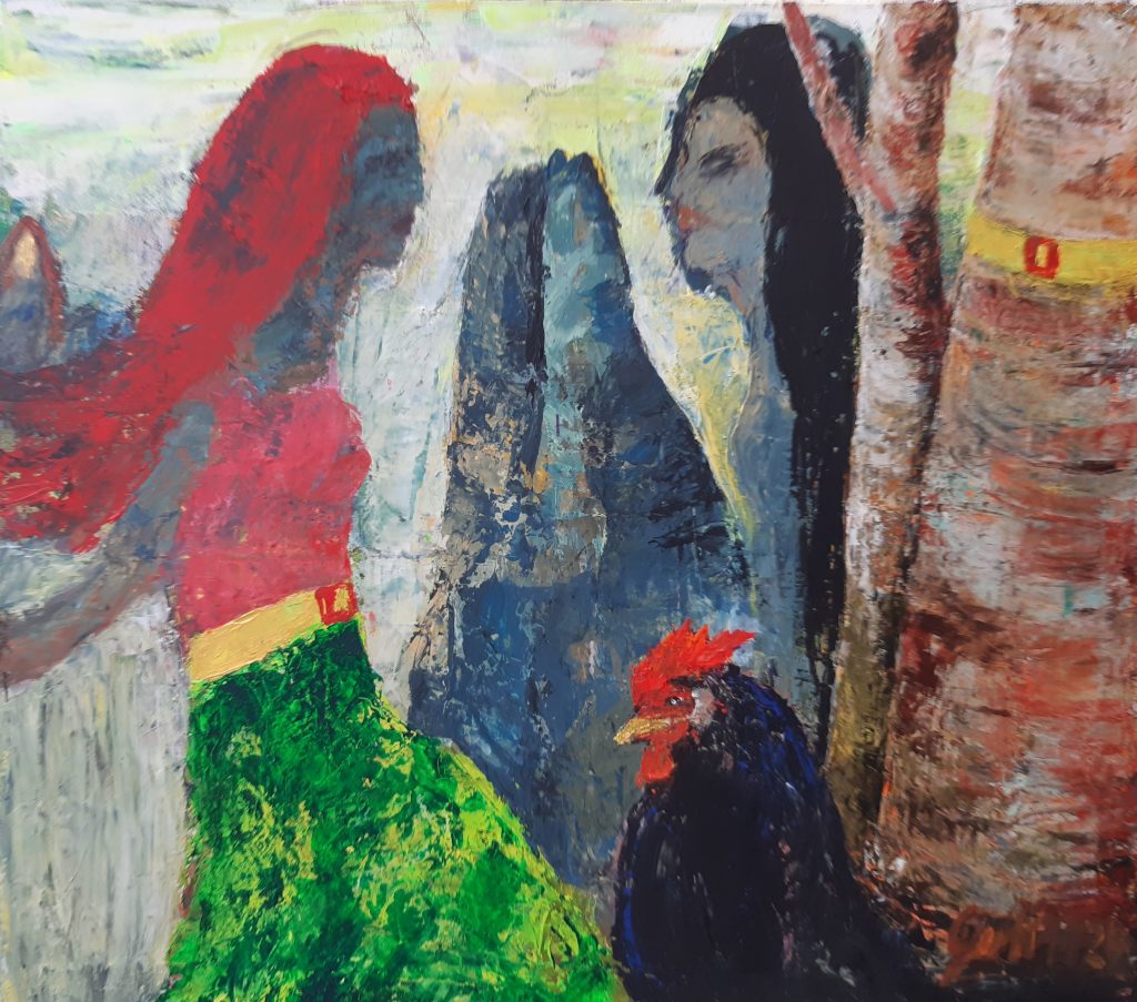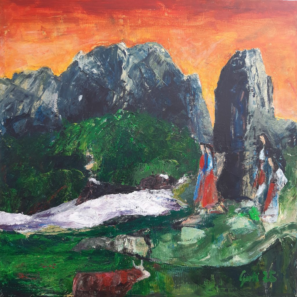 Drei Sennerinnen und Wurzelfrau, Acryl auf Leinwand, gespachtelt, 100 x 120 cm, 2025