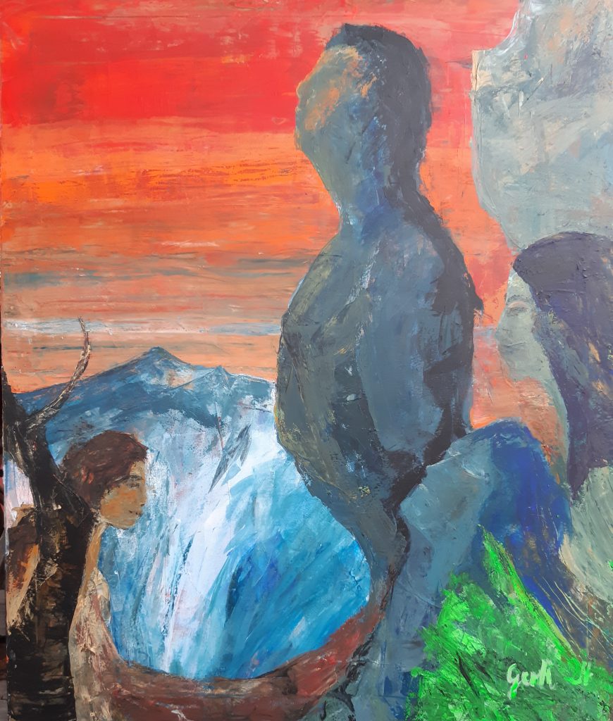 Engela tanzt, Engelsteinsage, 80x 90 cm, Acryl auf Leinwand, gespachtelt, 2024